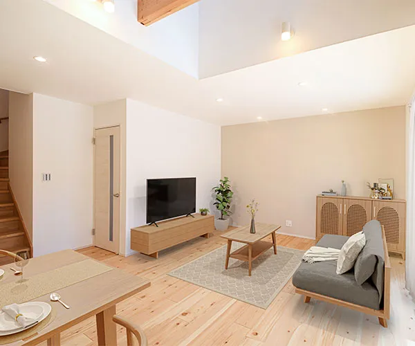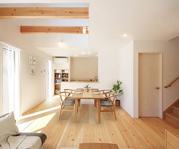 木の心地よさと美しさを堪能するダイニングは、キッチンから配膳しやすいレイアウトで、食事をスムーズに楽しむことができます。1階は吹き抜けが開放的なLDK。外と一体になる開放的なリビングダイニングと、食事しやすいカウンターキッチンでおうち時間を充実させます。