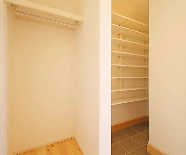 オープンタイプのクローゼットは、家族みんなのアウターや靴が一目瞭然。出し入れもスムーズです。