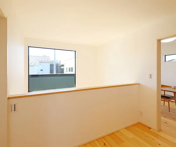 2階のホールには、物干しとアイロンがけなど家事がしやすいフリースペースがあります。計算された窓の配置で明るく、開放感があります。