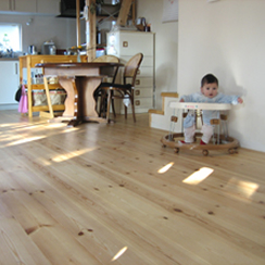 この家のリビングも、テーブルが似合うようにと考えました。普段は部屋の真ん中にあって、冬の朝日が食卓にキラキラします。ときどき、キッチンに寄せて子どもたちが遊ぶスペースを広くとります。小さなお友だちが遊びにきたときは、更に階段の下まで引っ込めて、走り回れるようにします。お客様のあるときは、テーブルの真ん中を開いて縦150cmに伸ばします。