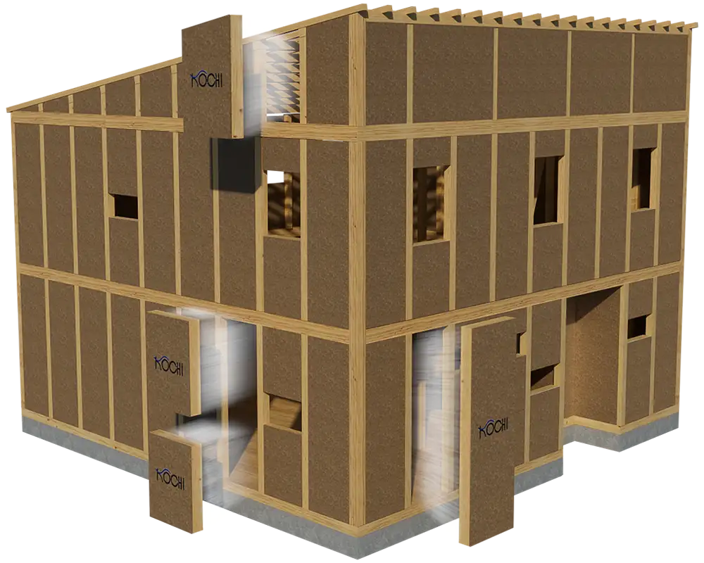 構造面材・枠材・間柱(まばしら)・断熱材のすべてを一体化して製造された「コーチパネル」は、建物の耐震性能を大幅に向上させる先進的なパネル構造です。これらの部材を一体成型することで、地震時にかかる力(地震力)を点や線ではなく、パネル全体の面でバランスよく受け止め、効果的に分散させることができます。