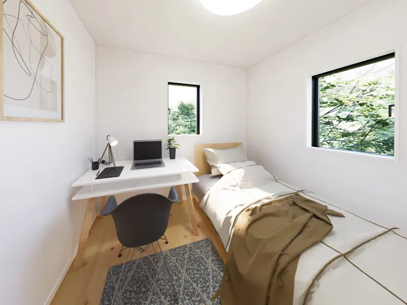 2階は寝室・洋室が計4部屋あり、家族それぞれのプライベートルームとして、また仕事や趣味などの用途によって最適な環境を設けて過ごすことができる空間です。フロアの中央に階段とトイレを設けることで、どの部屋で過ごしていても不便を感じることのない生活導線を確保した快適な間取りとなっています。うち2部屋はバルコニーでの往来も可能です。