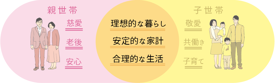 二世帯住宅という言葉が生まれたのはおよそ40年前の1975年。それ以来、『二世帯住宅』という言葉が一般的に定着しました。近年では女性の社会進出ということもあり共働きの家庭が増えたことや、加齢にともなうご両親のサポートなどから同居を望む傾向もあり、二世帯住宅を理想としている方が増えています。親の想いと子の願いから生まれる同居のメリットは、助け合いの心を基盤とし、次のことを実現してくれます。お互いを思いやることのできる『理想的な暮らし』。高熱費の削減や世帯収入の増加による『安定的な家計』。お互いの短所を補い、協力し助け合う『合理的な生活』。それらの二世帯住宅の良いところを欠かすことなく、理想の二世帯を実現するのが無垢スタイルの二世帯住宅です。