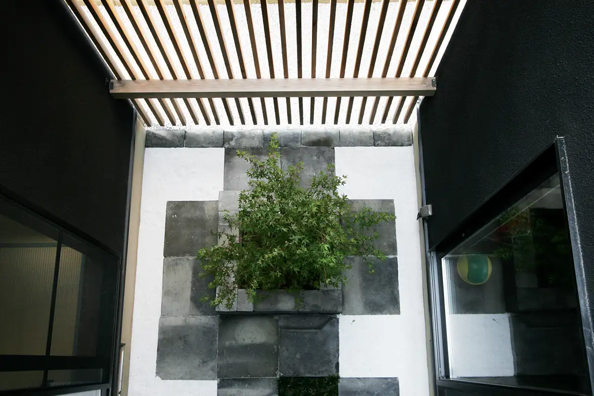 中庭を設けることで明るく開放的な空間が生まれ、プライバシーも確保できます。SE構法なら中庭の壁も耐震性を保ちながら設計可能で、1階もカーテンいらずのアウトドアリビングとして活用できます。