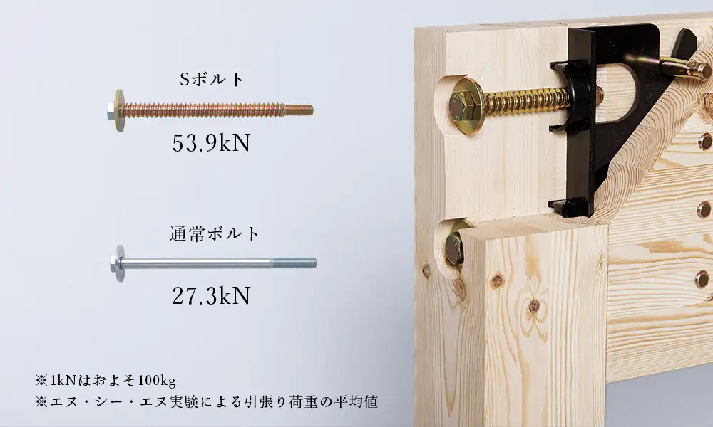全棟で採用されるSボルトは、従来ボルトの約2倍の引張強度を持ち、経年変化や引き抜きにも強い金物です。SE金物と組み合わせることで、木造のラーメン構造を支えます。