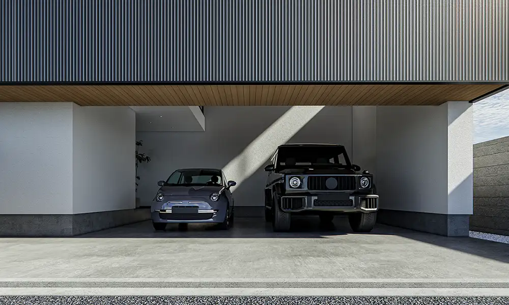 SE構法なら、最大3台まで駐車できる最大間口が9mまでのビルトインガレージを実現できます。敷地に余裕がなくても、自由度の高いプランによって駐車と居住スペースの両方を確保することが可能です。